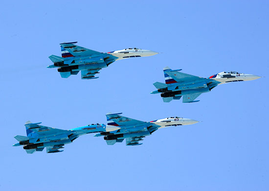 Помимо воздушного боя экипажи пилотажной группы «Соколы России» продемонстрируют групповой пилотаж в полётном порядке «ромб», состоящем из 4 истребителей, выполнят комплекс фигур – «петлю Нестерова», «бочку», «ракушку», «вираж», «роспуск» и другие на минимальных интервалах и дистанциях.