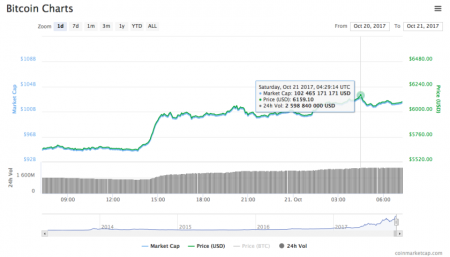 Сегодня мы, пожалуй, отвлечёмся от скучных теорий и практик майнинга, чтобы поговорить о приятном. Из последних хороших новостей отметим, сегодня биткоин опять подорожал и стал стоить аж 6100 американских долларов. Радости майнеров в последнее время нет предела, ведь менее месяца назад биткоин только преодолел планку в 5000 долларов, несказанно порадовав фанатов этой замечательной криптовалюты. Утром курс биткоина скакнул до 6159 долларов, но потом немного «успокоился» и откатился до 6100 долларов, — сообщает Coinmarketcap.
