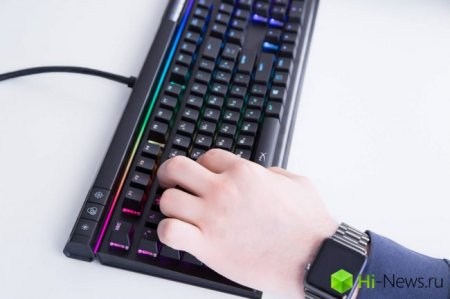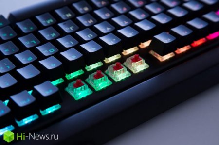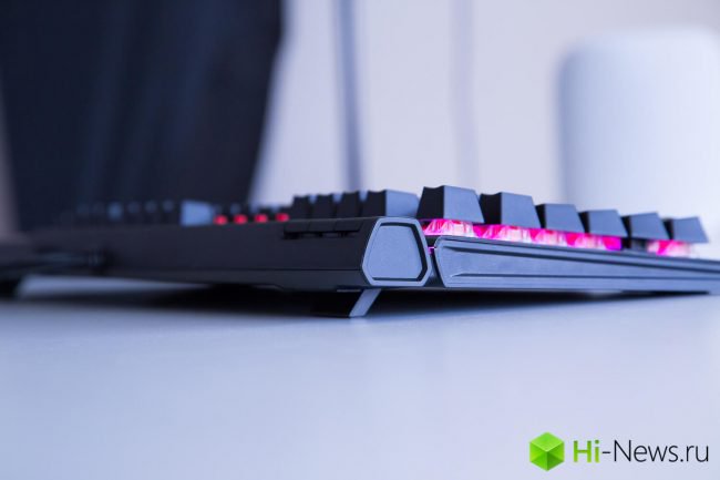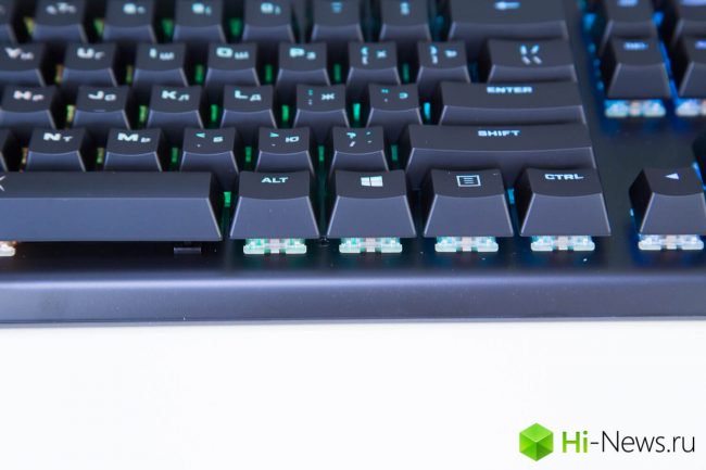 Да, мембранные клавиши немного «пошатываются», а пластиковые подставки выглядят не очень премиально, но, несмотря на это, клавиатура собрана очень здорово. Привычные пропорции клавиш позволяют оснастить клавиатуру дополнительными кейкапами. С локализацией разработчики тоже угадали: за счет того, что русские символы расположены правее (и меньше), а английские — левее и выше, оба символа отлично читаются в любое время суток, особенно с подсветкой.
