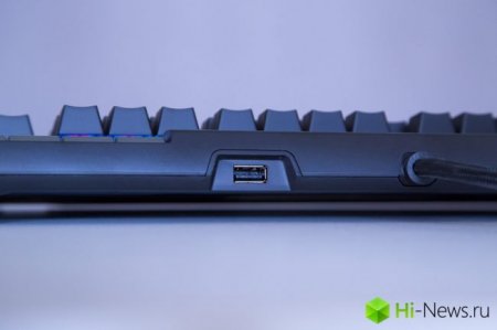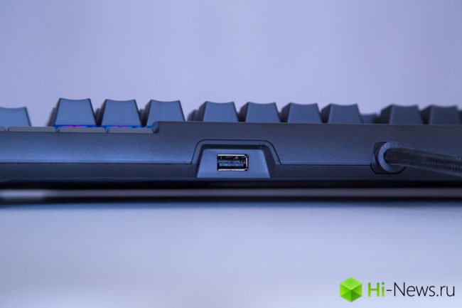 Весит клавиатура почти 1,5 кг (хотя, признаться честно, ощущается побольше), длина составляет 444 мм, ширина — 227 мм, а высота — 36 мм. Для подключения клавиатуры к компьютеру используются провод 1,8 м с двумя USB-коннекторами: один питает непосредственно саму клавиатуру, другой — служит для питания встроенного порта USB, который расположен спереди. Порт USB, кстати, разместили не для красоты: с его помощью можно заряжать другие устройства, подключить ту же мышь или флешку.