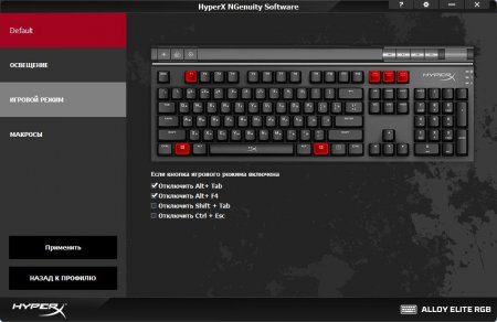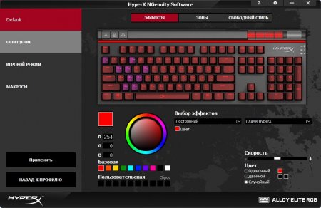 HyperX NGenuity Software представляет собой утилиту, разработанную специально для расширения возможностей и настройки HyperX Alloy Elite RGB. Основная его задача — расширить световые эффекты вроде «Пламени HyperX», при активации которого печать на клавиатуре превращается в настоящую домашнюю дискотеку. Помимо этого, программное обеспечение позволяет настроить игровой режим и профиль (например, набор для Dota или Counter Strike), записать или создать собственные макросы. Разобраться в утилите можно за 5-10 минут, настроить все под себя один раз — и забыть. А потом разве что добавлять новые макросы при выходе крутых игр.
