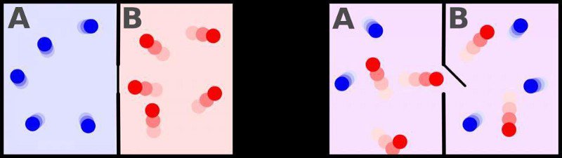 В некоторых случаях энтропия отлично описывает стрелу времени, например, почему кофе и молоко могут смешаться, но не «размешаться» обратно; почему лед тает в теплом напитке, но не возникает в холодном; почему разбитые на сковороде яйца никогда не собираются обратно в неразбитые и сырые. Во всех этих случаях изначальное состояние низкой энтропии (с большим количеством доступной, способной к работе энергии) переходило в состояние высокой энтропии (и низкой доступной энергии) с течением времени. Есть много примеров этой природы, включая комнату, наполненную молекулами: на одной стороне много холодных и медленных молекул, на другой же много горячих и быстрых. Дайте время — и комната будет полностью наполнена перемешанными частицами, которые уже невозможно будет разделить на два противоборствующих лагеря. Энтропия растет. Хаос правит.
