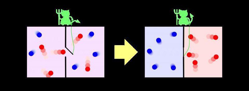 Впрочем, возможно, не все так необратимо. Есть подводный камень, которого не замечают многие люди, узнавая о втором законе термодинамики и увеличении энтропии: это касается только энтропии закрытой системы, или системы, на которую ничто не воздействует извне, а энтропия не убывает и не добавляется. Впервые эту идею попробовал раскрыть физик Джеймс Клерк Максвелл еще в 1870-х годах: достаточно иметь внешнюю сущность, которая открывает ворота между двумя сторонами комнаты, позволяя “холодным” молекулам протекать в одну сторону, а “горячим” — в другую. Этот мысленный парадокс стал известен как «демон Максвелла», и он на самом деле позволяет уменьшить энтропию системы.