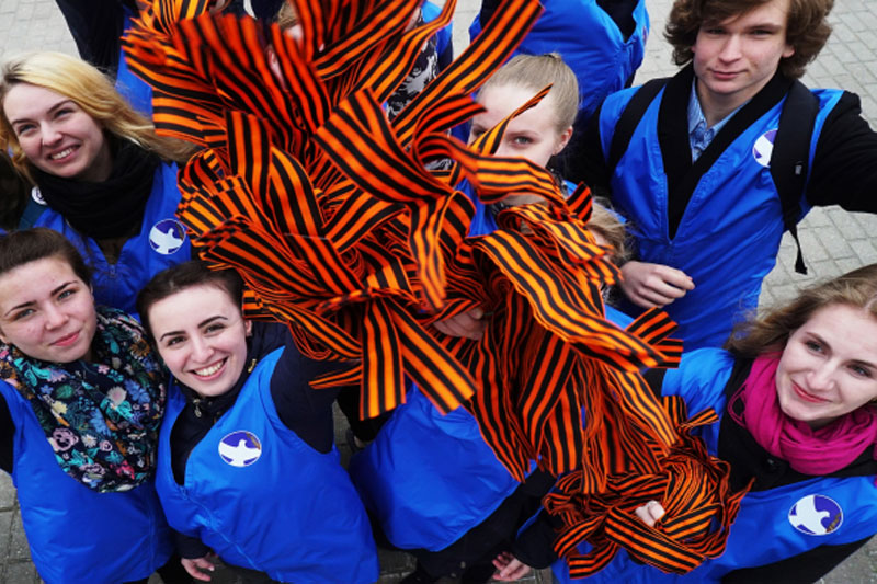 Девушки и парни в нарядных ветровках занимались распространением ленточек. Как рассказал 34-хлетний волонтер Владислав Жмурко, он стал этим заниматься потому, что его мой дед Илья Жмурко пал смертью храбрых в битве за Курскую Дугу. По его словам каждый нормальный человек должен уважать светлую память своих предков.