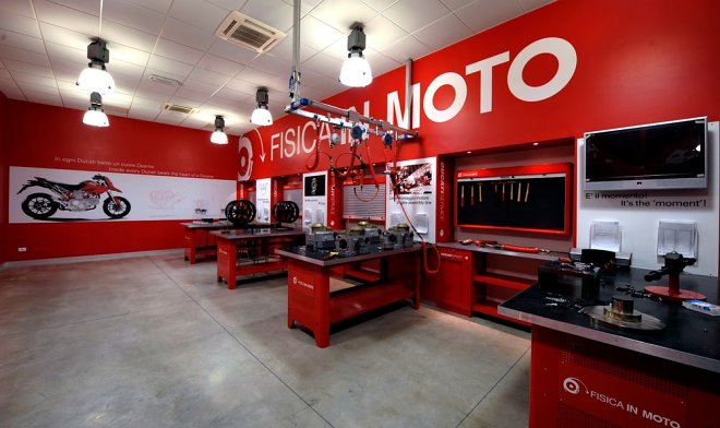 Fisika in Moto изначально задумывалась как часть глобальной программы Fondazione Ducati, посвященной популяризации бренда через спектр различных общественно-полезных мероприятия. Конкретно лаборатория первые десять лет функционировала в сотрудничестве с Высшей школой Мальпиги в Болонье, где разработали интерактивный семинар для студентов. Им наглядно показывали, как теоретические знания получают воплощение на реальном производстве.