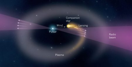 Наблюдения за пульсаром в созвездии Стрелы с помощью 305-метрового радиотелескопа в обсерватории Аресибо показали, что вещество, выбиваемое потоком его заряженных частиц с поверхности компаньона, действует как природная линза, в значительной степени упрощая астрономам задачу по рассмотрению источника излучения. Результаты последнего такого исследования были представлены в журнале Nature.