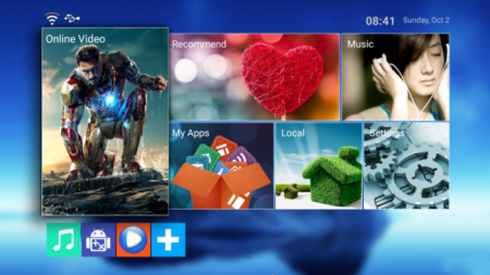 По интерфейсу, насколько я понимаю, SCISHION не стали адаптировать Android TV, вместо этого приставка использует обычный Android с кастомным лаунчером, поэтому интерфейс достаточно простой, но, как минимум красочный: на экране отображаются несколько крупных «плиток», предназначенных для подразделов вроде «Онлайн видео», «Локальный контент» и так далее, сами подразделы пустые, добавить в них приложения по вкусу — ваша задача.