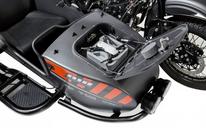 За основу взят классический «Урал», идейный наследник немецкого BMW R71 довоенного производства. Он укомплектован двухцилиндровым 750-кубовым мотором на 41 л.с., чью мощь можно передать и на колесо коляски, превратив байк в полноприводный аппарат. В коляске все еще помещается пассажир, он же оператор дрона, для которого отведено место в ее передней части. Здесь разместилась типовая док-станция для хранения и подзарядки батарей квадрокоптера DJI Spark.