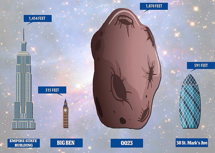 По данным американского аэрокосмического агентства NASA, в конце этой недели, в субботу 10 августа со скоростью 16 772 километров в час к нашей планете приблизится очень большой астероид. Ученые говорят, что объект имеющий название 2006 QQ23 размером с небоскреб. Его диаметр составляет почти 600