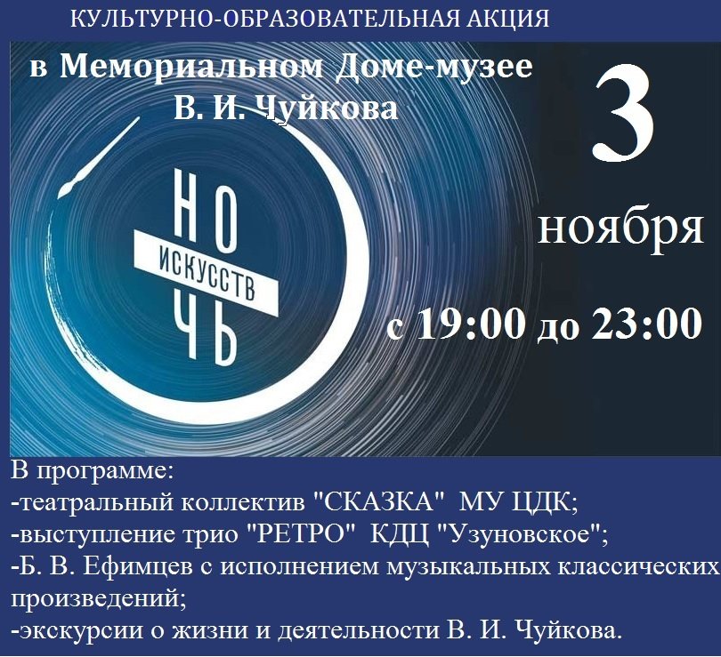 Ежегодная акция "Ночь искусств" пройдет 3 ноября с 19:00 до 23:00 в Мемориальном Доме-музее В.И. Чуйкова