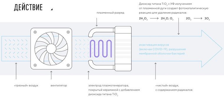 У такой очистки есть два очень важных преимущества. Первое — это высокая эффективность, которая существенно превышает остальные решения на рынке. Вторым является отсутствие расходных материалов. Это возможно благодаря тому, что грязный воздух проходит через холодный плазменный разряд. В результате образуется озон, а также изотопы большого числа атомов, из которых состоят бактерии (в основном их мембрана), ДНК и РНК вирусов.