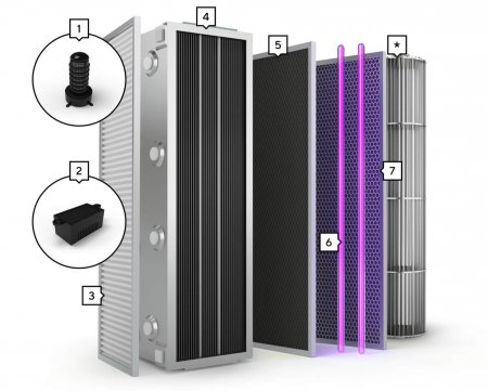 Все это происходит на первой ступени очистки, но есть и вторая ступень. Она доочищает воздух от активного озона, формальдегидов, альдегидов, бензолов и прочих примесей. Даже запах табачного дыма или кальяна полностью убирается. Для этого применяется то, что называется холодным катализом (реакцией на основе катализатора — диоксида титана). Как мы помним из школьного курса химии, это такой тип реакций, который проходит в присутствии катализатора, но сам катализатор в ней не участвует.