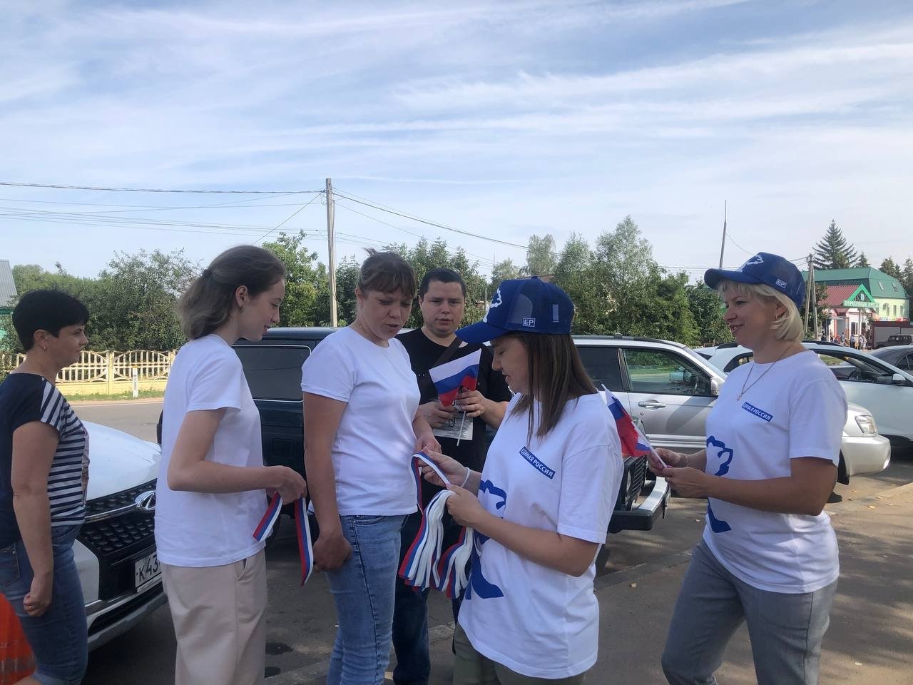 Затем в рамках реализации партийного проекта "Историческая память" провели акцию по раздаче ленточек триколора и флажков жителям округа на центральных улицах поселка.